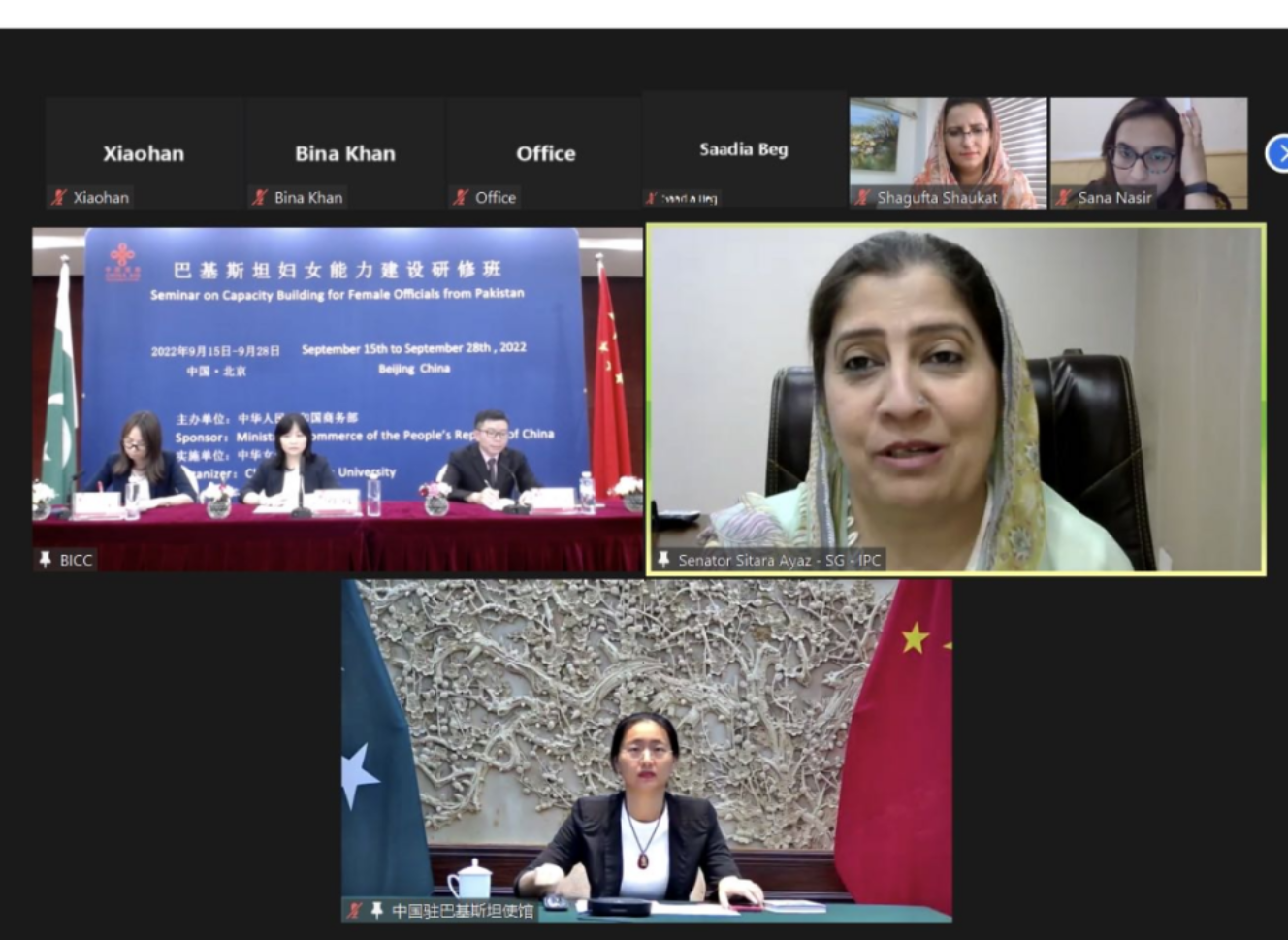培训班得到了商务部培训中心、全国妇联、巴基斯坦组织方和中国驻巴基斯坦使馆的大力支持,全国妇联联络部杨旸副部长,巴基斯坦国际议员大会秘书长、参议员西塔拉·阿亚兹女士,中国驻巴基斯坦使馆鲍众参赞和周应江副院长参加培训班的开班仪式并讲话。