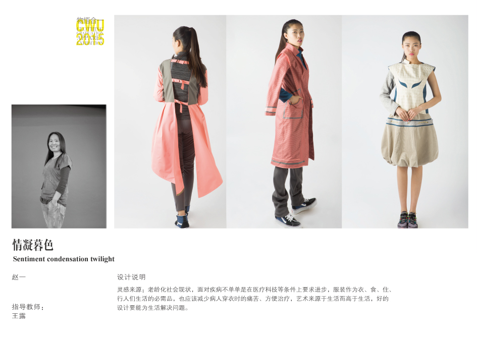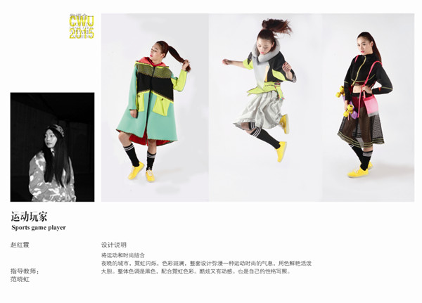 在前两届的中国大学生时装周活动中,中华女子学院艺术学院获得了充分的肯定和精彩的成绩。连续两年获得了 “年度市场潜力奖、年度优秀发布奖”的殊荣,受到媒体、企业和行业专家的好评。本次毕业设计的筹备与指导工作更是一次在教学改革与实践中的尝试。秉承为服装行业培养应用型创新设计人才的理念,教学团队将毕业设计作为对人才培养质量的考核,注重在启发学生创新的同时以更扎实的态度认识服装行业,了解大众的需求。同学们在本次设计方案中鲜明的突出了设计对人的关怀与美的情感体验。例如夜色的能发光的时尚骑行服装、兼具美丽与便利的为轮椅病患设计的休闲服、从银发老者到活力青年的家庭滑雪服系列和应对不同气候条件的情侣自驾多功能旅行装。在传统与前卫的触碰和感悟中,同学们也积极尝试将文化传承与时尚的结合,尤其注重实用性与创意的平衡,作品形式更为成熟和成品化。