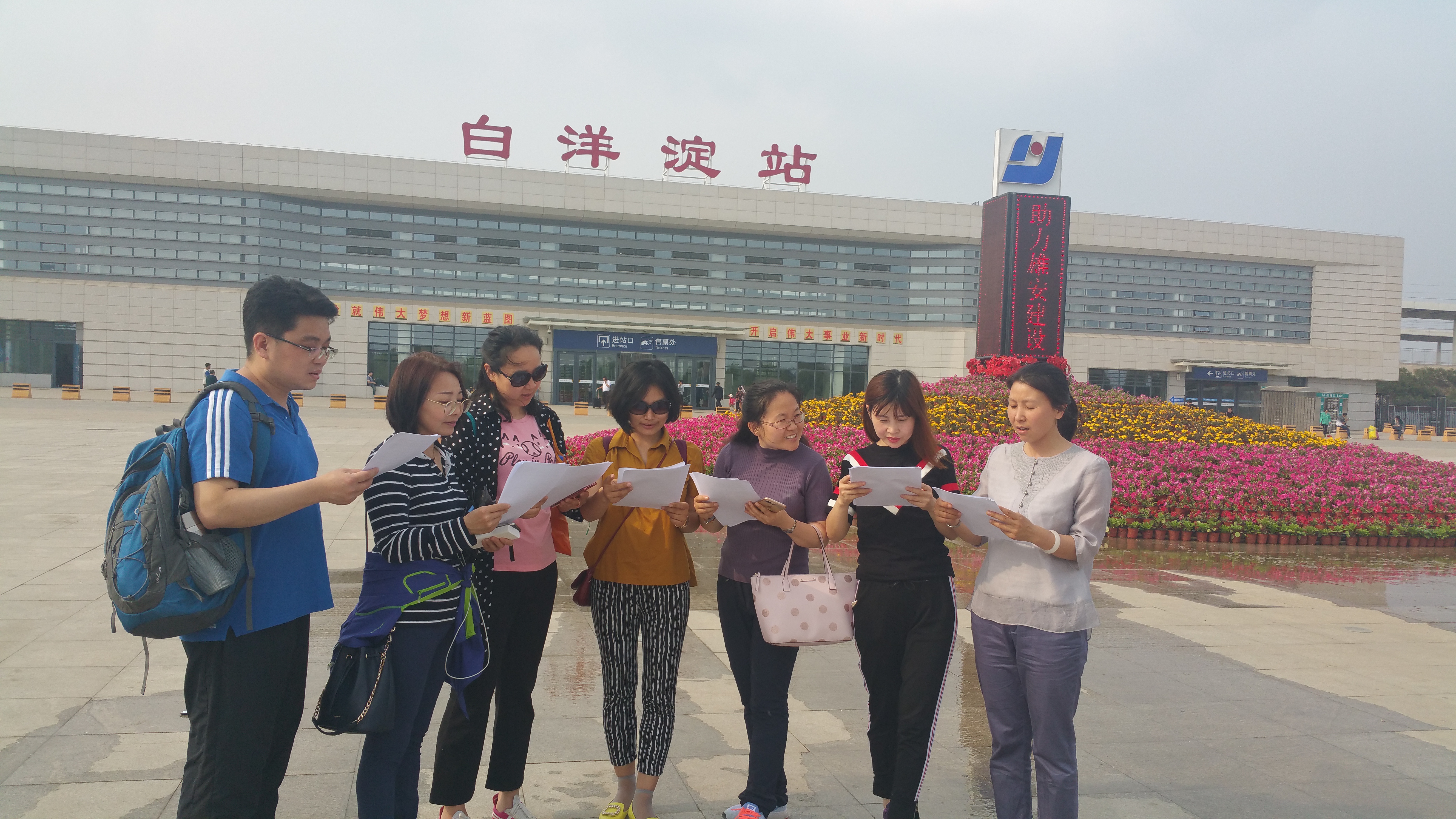 在容城白洋淀火车站候车广场上,同志们利用候车时间,开展了以“感受新时代——学习《习近平谈治国理政》第二卷诵读活动”为主题的现场学习会,同志们分别诵读了《用共产党员的标准严格要求自己》《加快建设世界一流大学和一流学科》两篇文章。