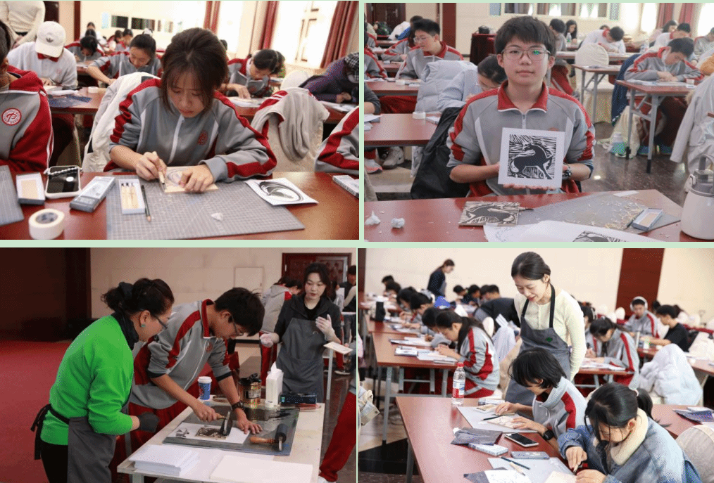 在《生肖版画印制》美育课程上,儿童发展与教育学院教师马丽娜为同学们系统讲解了版画概念、制作工具与核心技巧。同学们在马老师的引导下,沉浸于从画稿、刻版到印刷的完整创作过程,不仅亲身体验了传统技艺的精妙,更在方寸之间领略到中国版画深厚的艺术魅力与文化内涵,体现了“以美育人、以文化人”的课程目标。